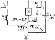继电器电路 见图9 。继电器K选用JRC—21F等超小型弱功率电磁继电器,线圈电压选6V,消耗功率0.36W。由于继电器线圈工作电流60mA,比玩具电动机工作电流小,比蜂鸣器、发光二极管工作电流大,因此设计电路时各元件参数介于两者之间,图中参数供参考。在图9继电器电路中,F为衔铁,D为常闭触点,E为常开触点。当控制开关S闭合时,继电器吸合,常开触点F-E接通,发光二极管VD1点亮,R2为限流电阻器。图9控制开关S换成干簧管开关、双金属复片开关,就可以进行磁控和热控自动控制了。继电器触点可以根据需要选用常开或常闭触点。由于继电器触点与传感控制电路隔离,选用JRX型继电器,其触点可以接220V交流电,直接驱动交流电用电器。这些简单的自动控制器有什么用途呢?比如,利用荧(日)光灯中启辉器中的双金属复片,改制成可控温度传感器,制作成简易电子恒温箱、酸奶器,甚至炕头孵化鸡蛋的过热、过冷报警器等。